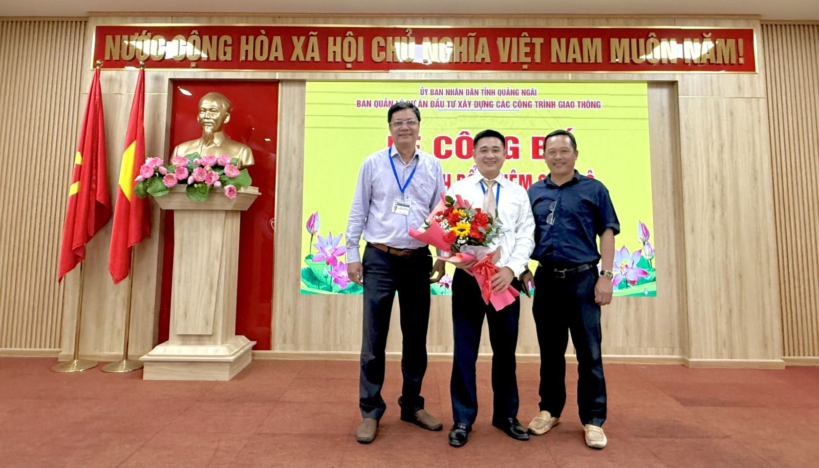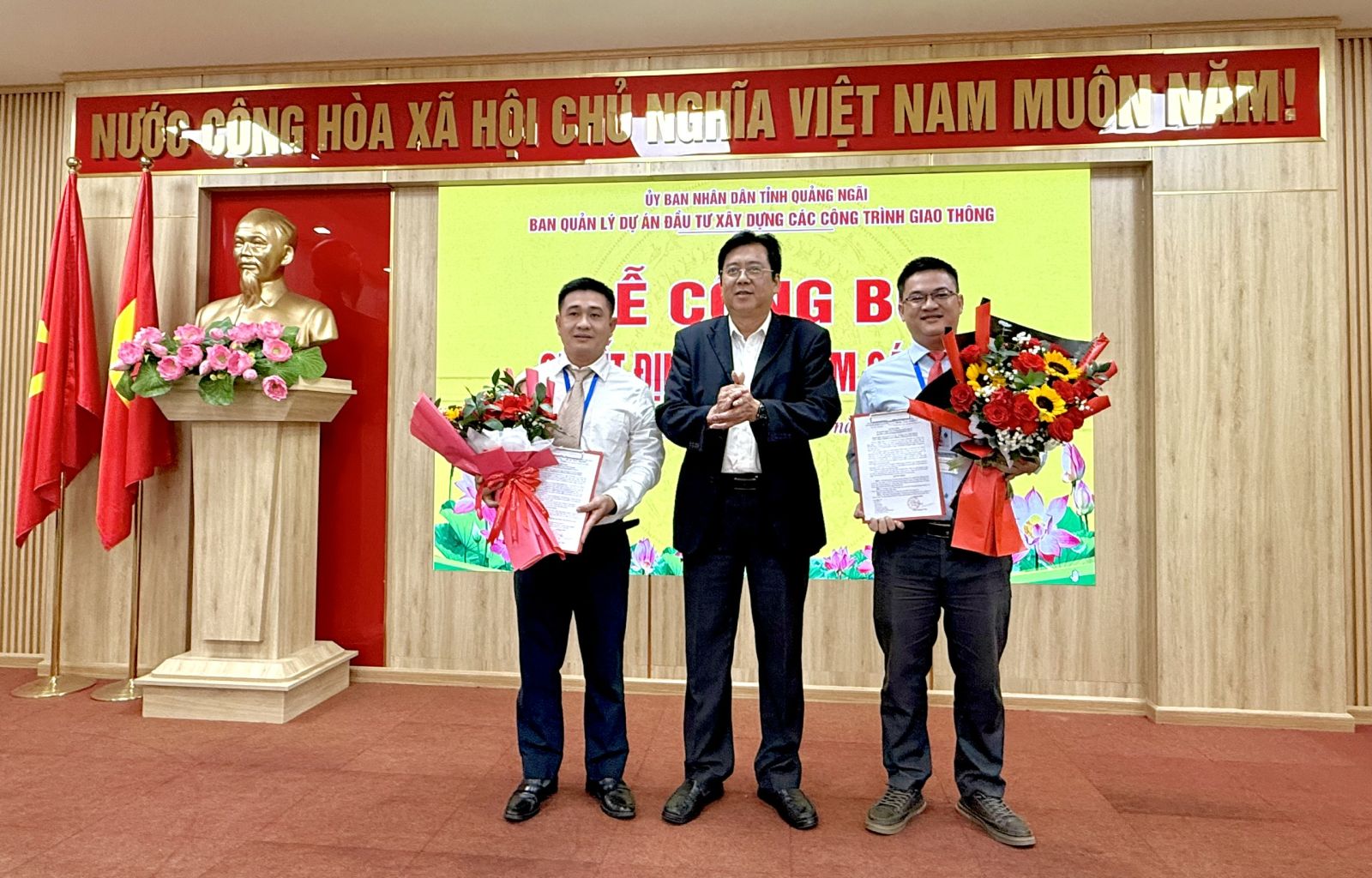 Đ/c Trần Hoàng Vĩnh - Giám đốc Ban Quản lý dự án trao Quyết định bổ nhiệm và tặng hoa chúc mừng