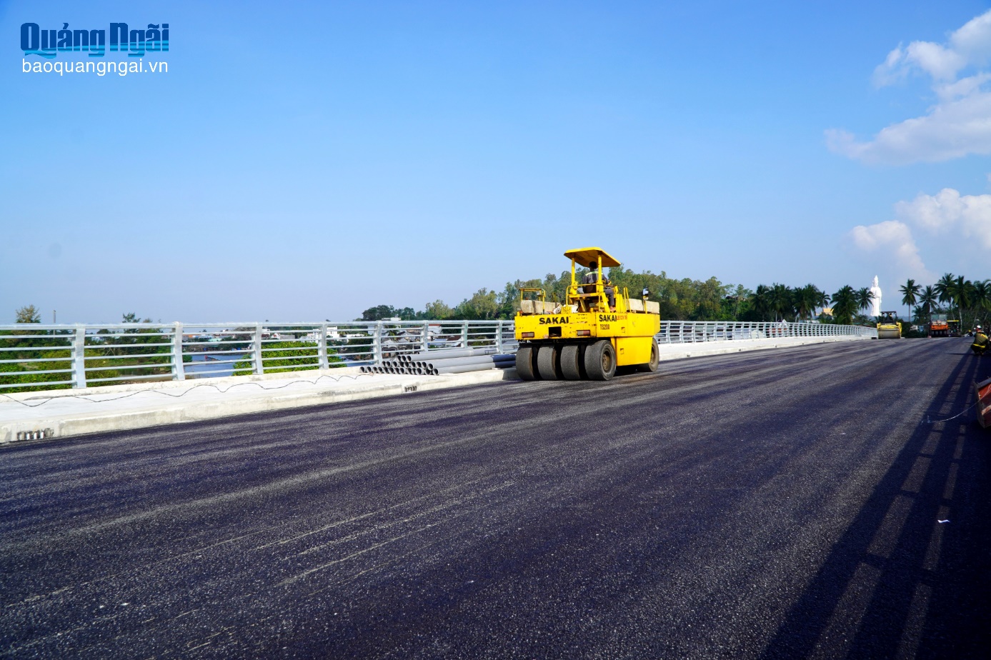 Thi công thảm nhựa mặt cầu Nghĩa Hà thuộc dự án Đường ven biển Dung Quất - Sa Huỳnh đoạn qua xã An Phú.