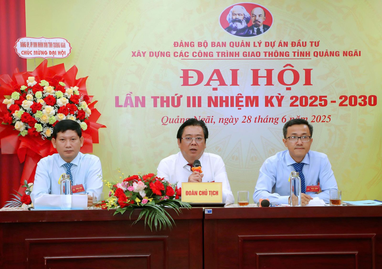 Thực hiện Kế hoạch của Đảng ủy Ủy ban nhân dân tỉnh Quảng Ngãi về tổ chức đại hội đảng bộ các cấp, tiến tới Đại hội đại biểu toàn quốc lần thứ XIV của Đảng, chiều ngày 28/6, Đảng bộ Ban Quản lý dự án đầu tư xây dựng các công trình Giao thông tỉnh Quảng Ngãi (viết tắt là Ban Quản lý dự án) đã long trọng tổ chức Đại hội lần thứ III, nhiệm kỳ 2025 - 2030.