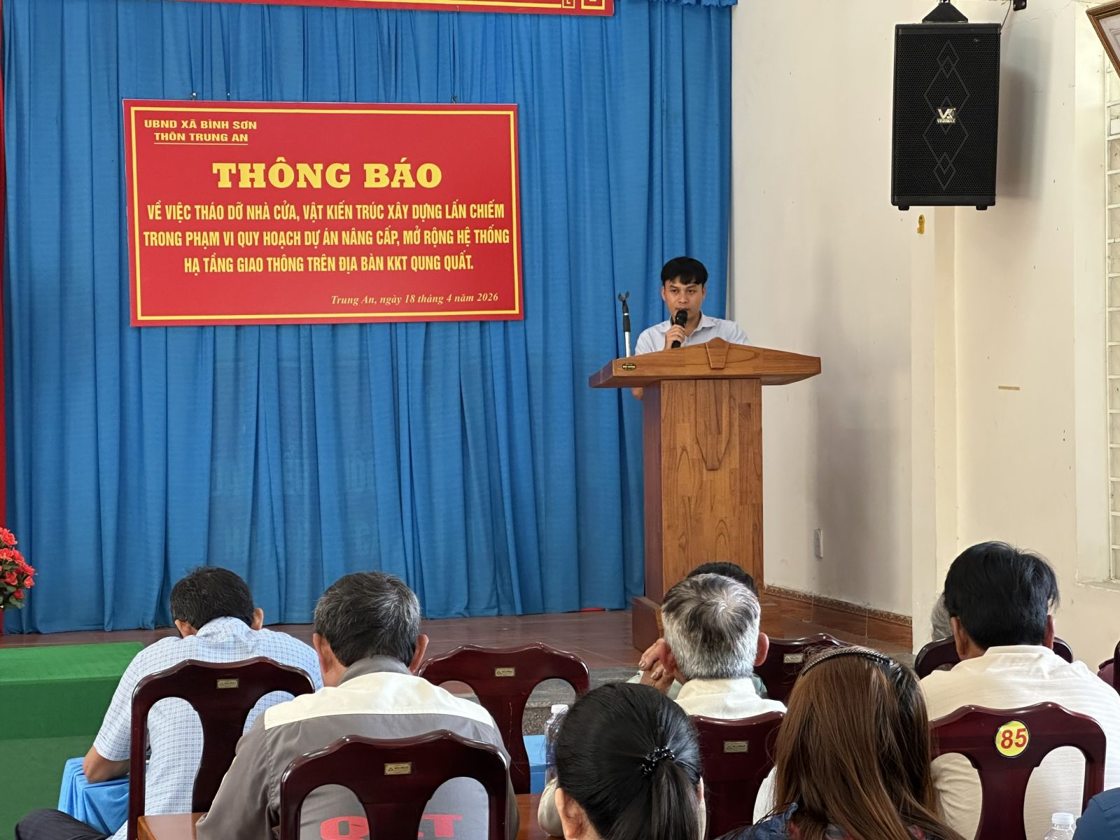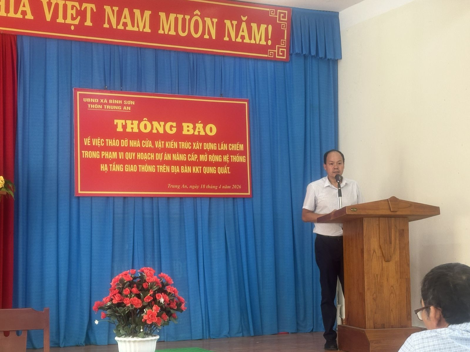 Chiều ngày 18/4/2026, Ban Quản lý dự án đầu tư xây dựng các công trình Giao thông tỉnh Quảng Ngãi cùng với UBND xã Bình Sơn và các đơn vị liên quan tổ chức cuộc họp tại thôn Trung An, xã Bình Sơn để triển khai Thông báo số 122/TB-UBND ngày 13/4/2026 của UBND xã Bình Sơn về việc tháo dỡ nhà cửa, vật kiến trúc xây dựng lấn chiếm trong phạm vi quy hoạch dự án Nâng cấp, mở rộng hệ thống hạ tầng giao thông trên địa bàn KKT Dung Quất.